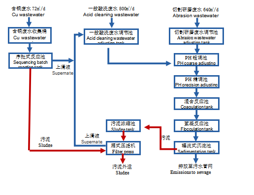 該企業(yè)車間產(chǎn)生廢水大致可分為一般酸洗廢水、切割研磨廢水、電鍍含銅廢水和其他濃液,其中濃液的水量較小,可由桶槽獨(dú)立收集后委外處理。本工程針對(duì)一般酸洗廢水、切割研磨廢水和電鍍含銅廢水進(jìn)行設(shè)計(jì)處理。